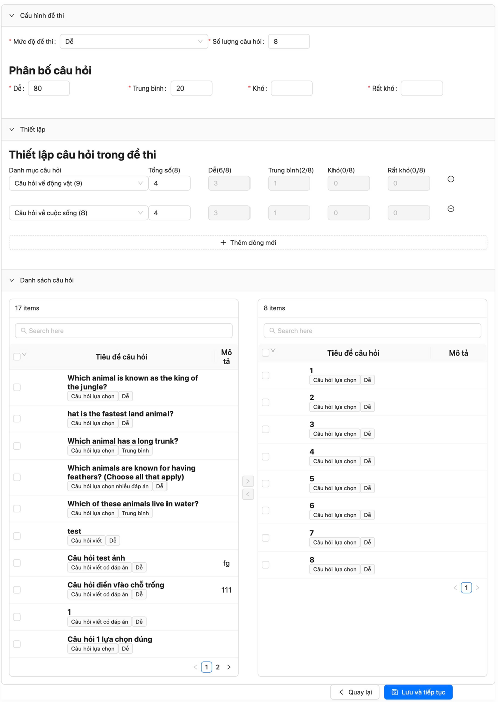 - Quản lý câu hỏi và ngân hàng đề: Hỗ trợ câu hỏi đơn lẻ, nhóm câu hỏi, phân loại theo mức độ và mục tiêu.